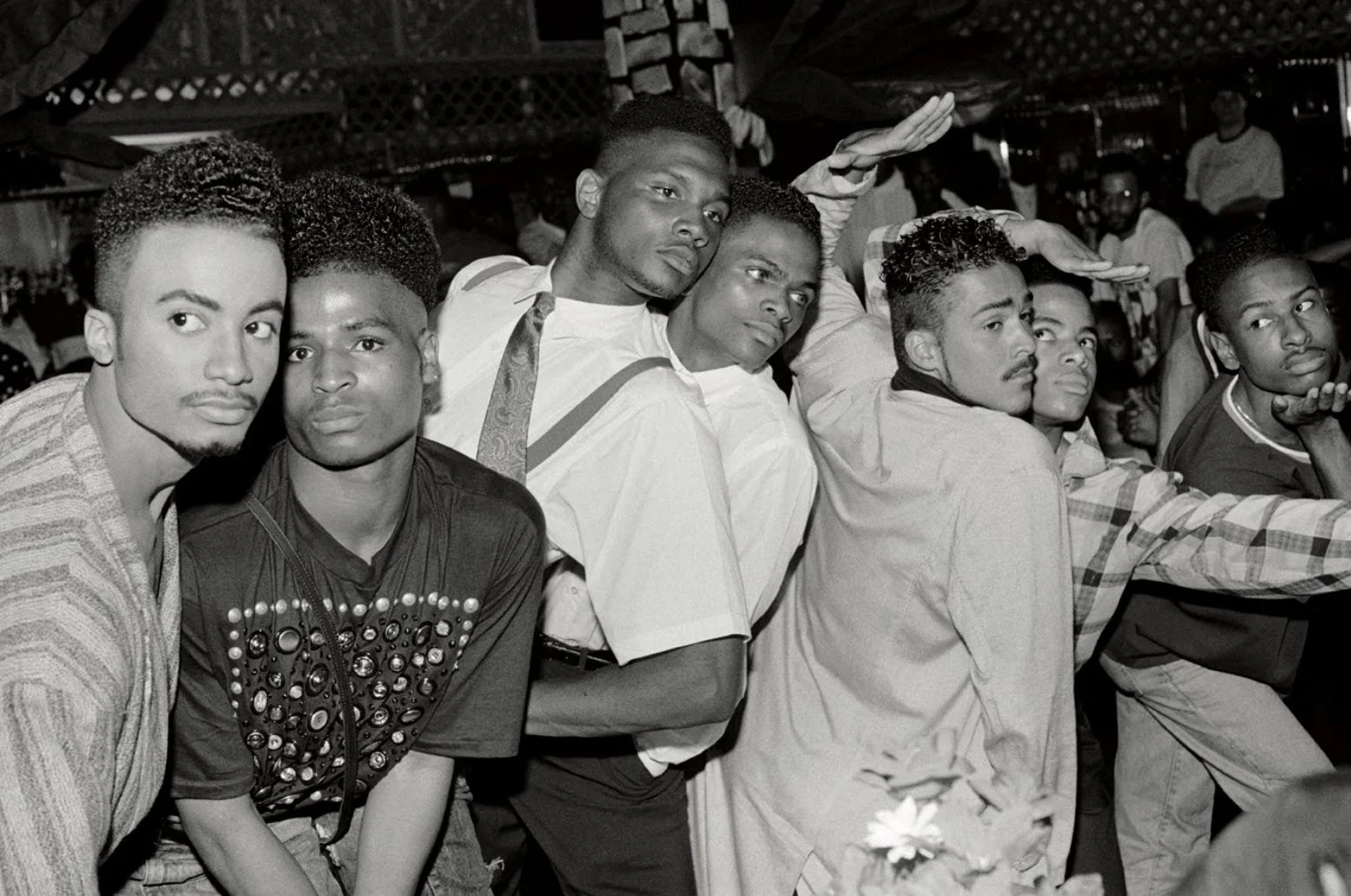 Left to right: Whitney Elite Garçon, Ira Ebony Aphrodite, Stewart LaBeija, Chris LaBeija Revlon, Ivan Adonis Chanel, Jamal Adonis Milan, Roland LaBeija. At the House of Jourdan Ball, 1989. Photo: Chantal Regnault