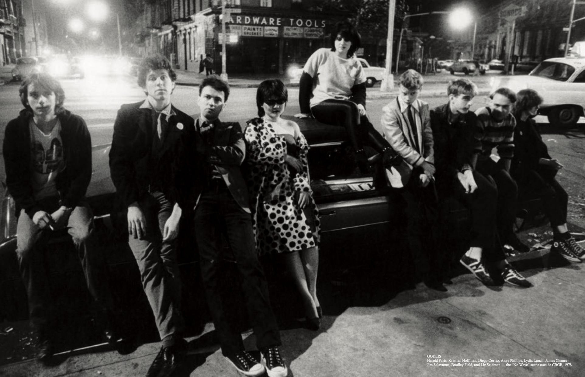 Left to right: Harold Paris, Kristian Hoffman, Diego Cortez, Anya Phillips, Lydia Lunch, James Chance, Jim Sclavunos, Bradley Field, Liz Seidman, outside CBGB, 1978. Photo: GODLIS