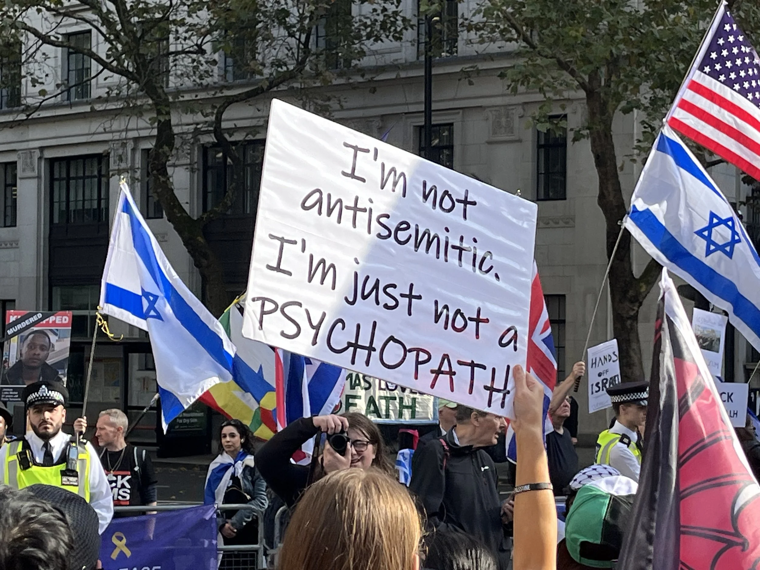 Palestine solidarity demonstration in London, 5 October 2024. Zionists stage counter-rallies at each demonstration. For reasons unknown, or perhaps too well know, the Met Police allow them to always pitch their counter-protest in the mid-path of the solidarity rallies. They usually pump out loud rave music, make abusive gestures, resort to bigoted sloganeering, and wave an array of colonial flags. They call us antisemitic but we’re not antisemitic, we’re just not psychopaths