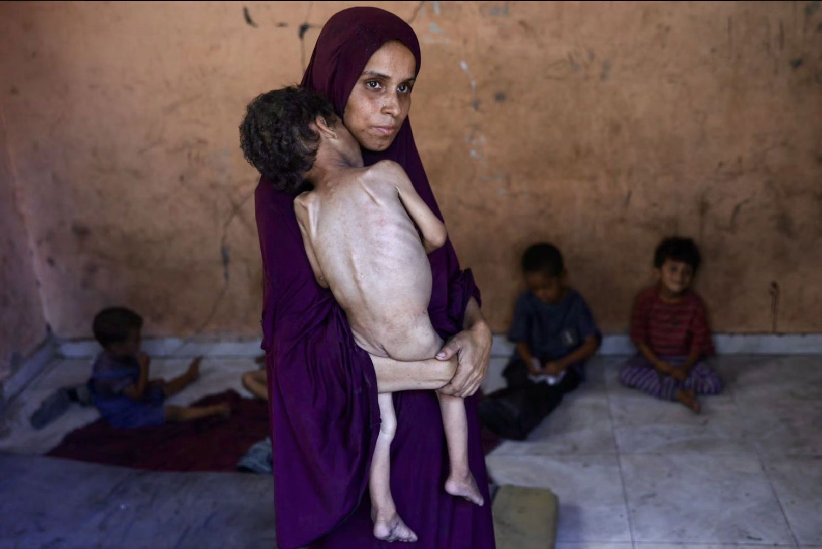Naeema, a 30-year-old Palestinian woman, holds her malnourished 2-year-old son, Yazan, in their home in the Shati refugee camp west of Gaza City on Wednesday 23 July.