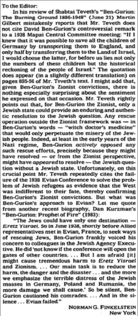 Ben-Gurion cited in Shabtai Teeth’s Ben-Gurion: The Burning Ground 1886-1948, referenced by Norman Finkelstein in a letter to the New York Times, 12 July 1987.