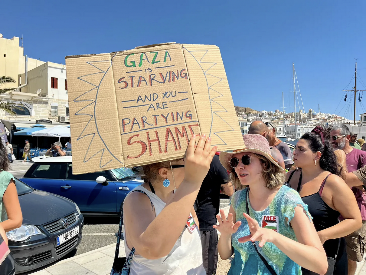 Syros protestors: saying it like it is. I’m all for a good party but not when the participants are letting their hair down while their country perpetrates a genocide, not when the music drowns out the screams of those being systematically murdered, not when the dancing is effectively taking place on killing fields.