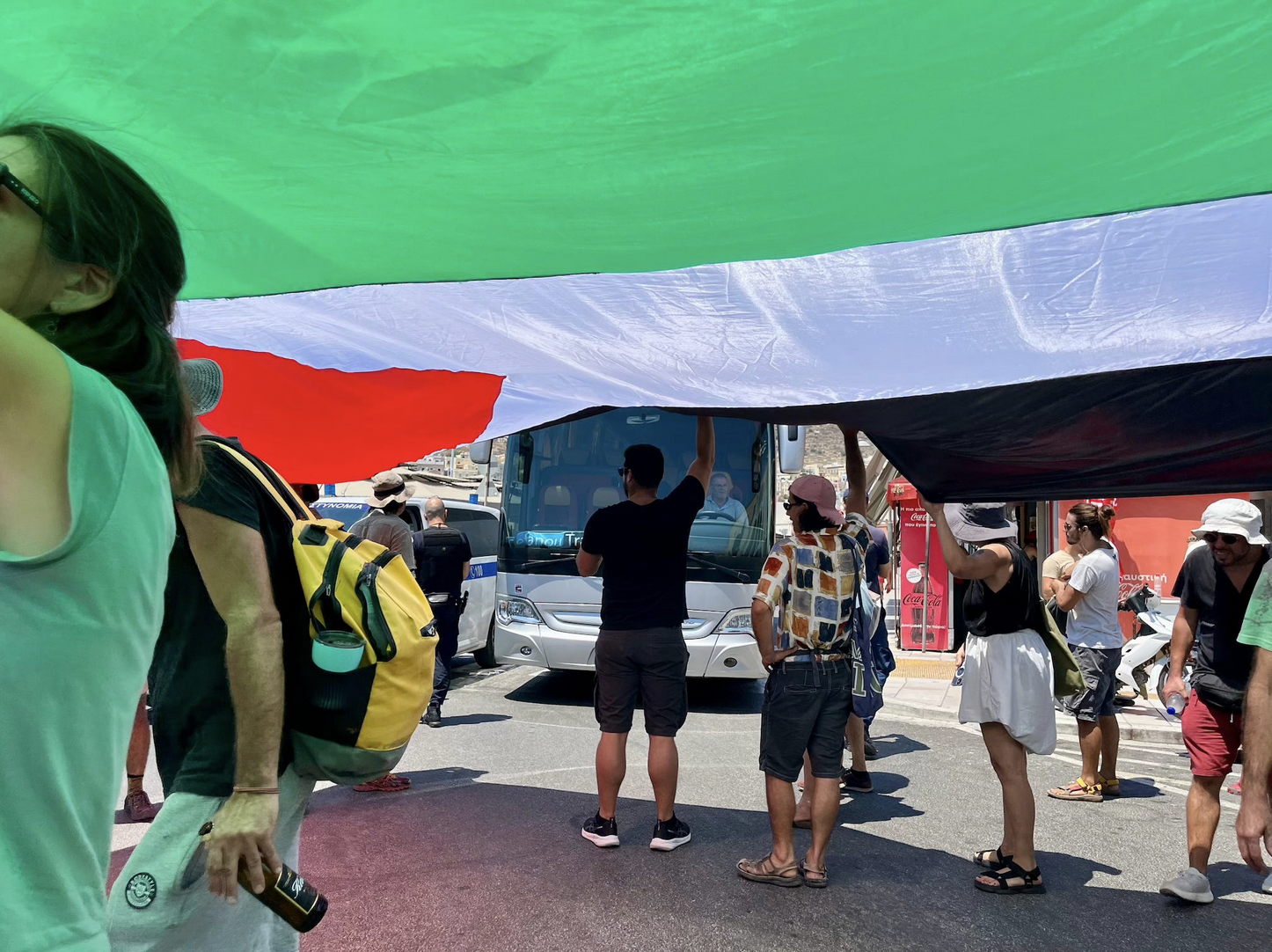 Syros protestors used a giant Palestinian flag to block the first coach scheduled to pick up the Israeli-Jewish tourists on board the Crown Iris from accessing the square that led to the cordoned-off port area when the cruise liner had docked. The protestors decided that the prospect of welcoming a group of tourists who are inextricably linked to genocide was revolting to them—so they revolted.